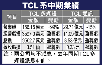 【本報訊】由於海內外手機業務在上半年度均錄得虧損,TCL通訊(2618)中期業績由盈轉虧,虧損8.53億元。該公司未有就何時扭虧為盈訂下時間表。同系TCL多媒體(1070)續受海外業務拖累,中期同樣盈轉虧,蝕9562.7萬元。TCL多媒體主席李東生預期,明年中整體彩電業務可重獲盈利。