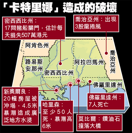 總統喬治布殊宣布路易斯安那州和密西西比州為災區,隨時提供緊急救援物資。「卡特里娜」掠過密西西比州東部後,已減弱為熱帶風暴,預計以時速一百零五公里的風速繼續向北部移動,將吹向中部;東南面亦可能出現龍捲風,為田納西州和俄亥俄州帶來大量雨水。 美聯社/路透社/法新社