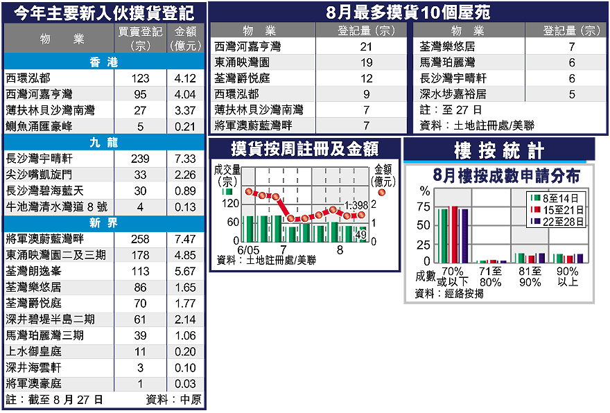 另外,中原地產研究部統計,十大藍籌屋苑摸貨成交,8月份只有4宗,為鴨脷洲海怡半島、荔枝角美孚新邨、沙田第一城及天水圍嘉湖山莊各1宗。相對上月的24宗,大減83%,屬過去11個月新低。但統計今年首8個月,10大屋苑則共錄得241宗摸貨成交,較去年同期的92宗,多1.6倍。