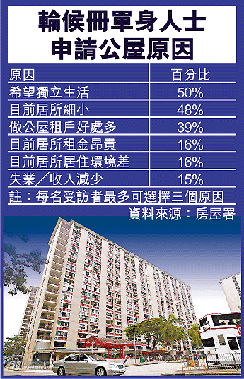 【本報訊】房屋署一項調查發現,過去六年單身人士申請公屋數目大幅飆升近三倍,平均年齡亦降至三十五歲,當中不乏高教育水平人士,甚至有仍在求學的青年已申請公屋。這些單身人士申請公屋有三大理由,其中一個是「公屋租戶好處多」。