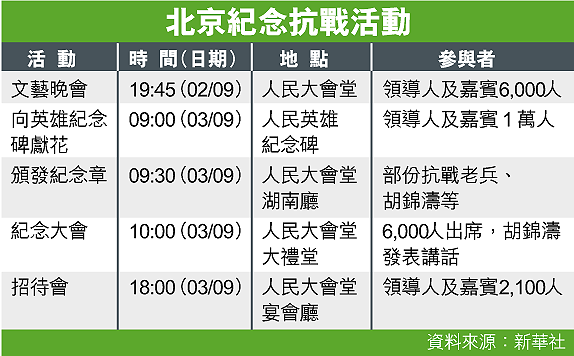 國務院新聞辦昨舉行記者會,公布官方紀念抗戰勝利六十周年活動的安排,包括大型文藝晚會、向人民英雄紀念碑敬獻花籃、向抗戰老兵和國際友人頒發紀念章等(見表),中共總書記、中央軍委主席胡錦濤還將在紀念大會上發表長篇講話。