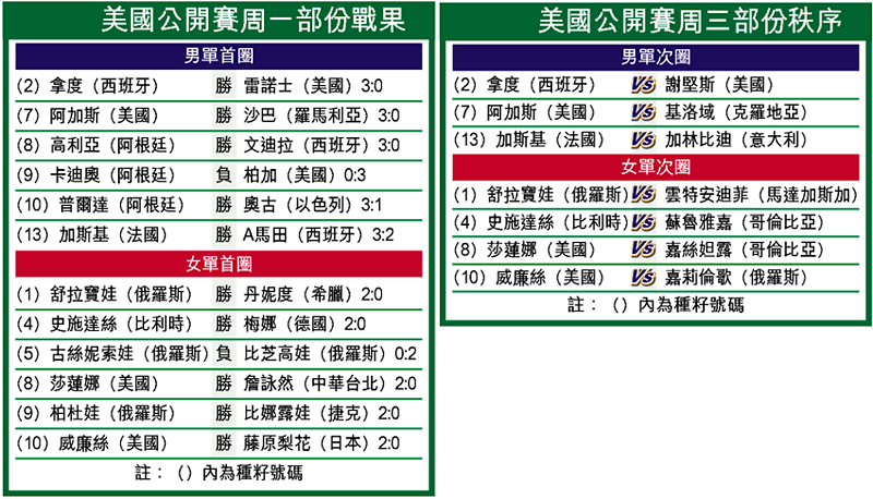 相比古絲妮索娃的「不幸」,做了一星期「一姐」的舒拉寶娃從拉傷胸肌中復出卻精神爽利,面對兩月前在溫布頓首圈爆冷擯走軒寧的希臘女將丹妮度,只花了六十六分鐘以直落兩盤六比一晉級。在美網賽從未超越第三圈的舒拉寶娃,不諱言希望在本年度最後一項大滿貫證明自己,她說:「過往我未算給紐約球迷顯示自己的能耐,希望今回能給這裏的觀眾多打數場好球。」