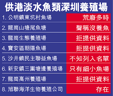 其餘四間身份存疑的養殖場分別為深圳市龍崗山塘尾魚場,自稱該魚場負責人表示沒有養魚,深圳市龍崗生態養殖場、深圳市寶安區朝陽魚場及深圳龍崗高州養殖場,記者按地址尋訪不果,部份連電話公司的商業登記也欠奉,一些魚場接受查詢時則支吾以對。