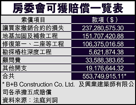 法官又指,房委會就地盤及大廈所做的地基加固及補救工程,均屬合理,法官又指B+B的地盤人員,提供假樁柱紀錄,是詐騙房委會,負責監工的興業建築師有限公司的地盤人員,通過紀錄亦屬欺詐,故接納B+B申請,裁定興業須承擔賠償額的一半。