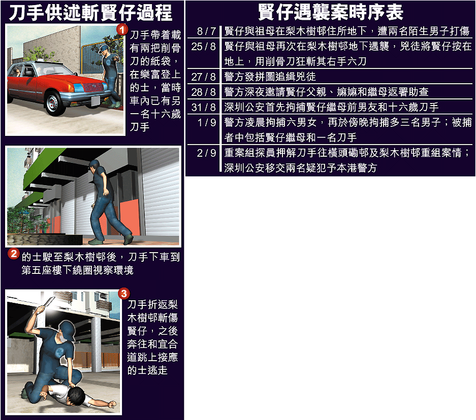 據該刀手供稱,當日(八月二十五日)下午近三時許,一輛的士在宏頌樓樓下接載他,當時車上已有另一刀手羅X豪(事後在深圳落網),稍後,的士駛往梨木樹邨。據該名身高五呎七吋,身形瘦削的刀手向探員供稱,在抵達梨木樹邨後,羅指示他下車視察環境,結果,他在賢仔所住的第五座樓下繞了三圈,然後上車,再往禾塘嘴街一間食肆飲下午茶,並與一名同黨見面。