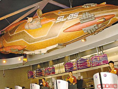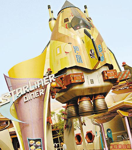 沿着大街行5分鐘,在右手邊的便是「明日世界」,要醫肚嗎?認住那艘太空船,穿過船底便來到「火箭餐廳」。主打美式快餐食物,頭岳岳望住個餐牌數一數,魚柳包、芝士漢堡包、雞扒包、炸雞籃……計埋兩款兒童餐,合共得8款餐揀,選擇唔多但勝在唔使等,加上餐廳有成800個位,搵位連埋食半個鐘搞掂,嗱嗱臨食完繼續搏殺玩過,是一眾大玩精的快速補充站。喜歡試新口味的必叫叉燒漢堡包,賣相似豬柳漢堡但換上一大片叉燒,甜甜哋的叉燒夾埋青瓜同生菜,味道出奇地夾;每款餐可配薯條或飯,吓?漢堡包配飯,咁騎呢?實情那碗是雞油飯,幾香㗎,又夠飽肚。