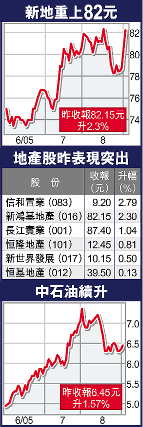 港股昨日高開54點後,一度出現回吐壓力,在15100點水平徘徊,上午收市前買盤增加,推動恒指升上15200點以上,收報15221.89,升78.14或0.52%,成交208.62億元,本周累積升幅239點。即月期指收報15217,低水4點,成交合約近3萬張。地產股持續受到資金追捧,信和置業(083)及新鴻基地產(016)升幅顯著,超過2%(見表)。