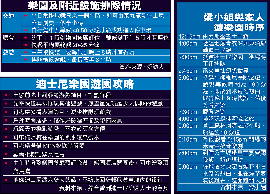 另一名入場市民梁小姐中午由元朗乘巴士,再轉乘地鐵到迪士尼樂園,共花了一小時四十五分鐘,其間想玩小熊維尼歷險之旅,發現等候時間為三小時,即時放棄;改往米奇幻想曲,卻取得晚上九時入場的快證,卻與煙花滙演的時間相撞,經取捨後寧看煙花,結果沒有機會一睹這個熱門節目。