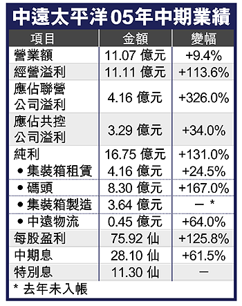 【本報訊】中遠太平洋(1199)受惠於中國經濟及出口增長,加上年初出售深圳蛇口碼頭17.5%股權獲利4.8億元,令截至6月底中期純利大增1.31倍,至16.75億元,創上市新高;中期息28.1仙,另派特別息11.3仙,派息比率51%。中遠洋中午公布業績後,股價曾高見16.1元,終收報15.85元,升1.28%。