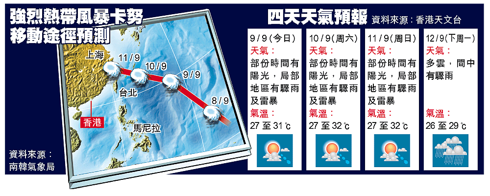 強烈熱帶風暴卡努昨日集結在菲律賓以東的太平洋,並正在向西北方向移動。根據南韓氣象局及日本氣象廳初步預測,卡努在明日至後日最接近台灣,下周一迪士尼揭幕當天登陸廈門及福建一帶,不會正面吹襲香港。不過,香港天文台預測,卡努會為迪士尼開幕日帶來不穩定天氣。