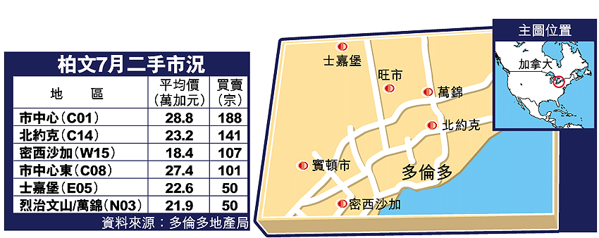 至於二手市場,根據多倫多地產局數字,7月合共有7387個單位轉手,是歷來同月第二高,僅次於03年7月的8084間歷史新高,當中柏文佔29%,共2175間。成交量雖然增加,但平均二手屋價比6月份下跌5%,至32.6萬元,相比去年同期,則錄得4%升幅。