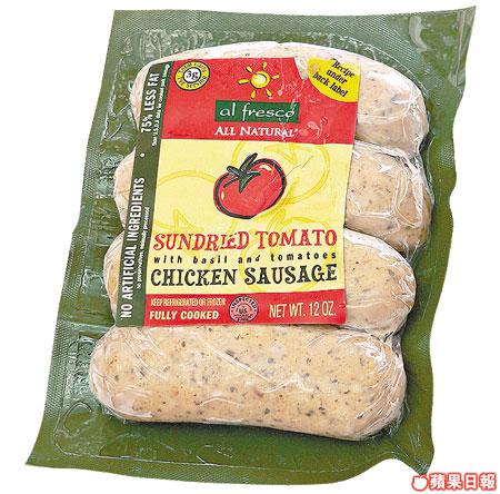 乾番茄加去皮雞肉,聲稱比美國一般豬肉腸少75%脂肪,不含人造材料、防腐劑等。