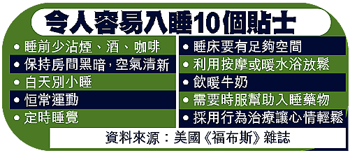 《福布斯》雜誌綜合了十種令人容易入睡的小貼士,供讀者參考。小貼士包括:睡前少沾煙、酒、咖啡;保持房間黑暗,空氣清新;白天別小睡;經常運動、定時睡覺,睡前可透過按摩及暖水浴令自己放鬆心情等。