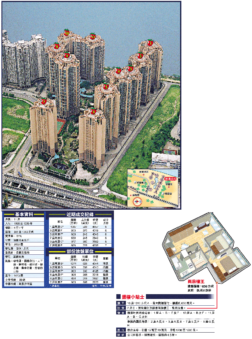 聽濤雅苑兩房戶僅佔總數一成,並非主流,面積由601方呎起,入場費230萬元,較市中心兩房戶貴60萬至80萬元,上車客較少。餘下近九成屬三房連套房單位,當中大部份附設有貯物房或工人房,切合四至五口家庭,樓價300餘萬至600餘萬元。