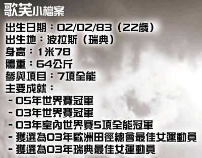 奧運兼世界冠軍的瑞典女「鐵人」歌芙(CarolinaKluft),是當今國際田徑壇上少見實力與美貌兼備的可人兒;這名七項全能女王自四年前初登國際競賽舞台以來,鮮見失敗,更是歷來僅第三位能衝破總分七千分大關的女鐵人。成功背後,離不開持之以恒的鍛煉及努力。