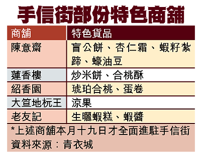 時值中秋,由即日起至本月十八日,手信街特設售賣月餅攤檔。之後,二十間本土老字號食品店舖包括陳意齋、紹香園、大澳老友記等,將於本月十九日全面進駐手信街,出售不同本土食品,至下月十六日為止。