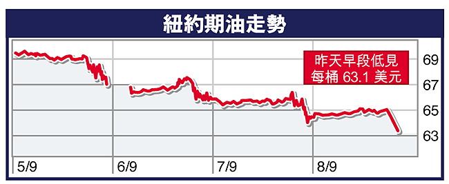 國際原油價格昨天先升後回落,紐約原油價格一度挫至每桶63美元邊緣,原因是美國上周原油和汽油庫存均多過預期。