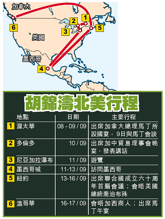 胡錦濤昨日上午離開北京,在當地時間八日下午(香港時間今晨)抵達加拿大首都渥太華後,將出席加拿大總督的歡迎儀式,慶祝兩國建交三十五周年。加拿大總理馬丁將在當地時間八日晚上設宴款待胡錦濤,並在翌日和胡錦濤舉行會談,討論氣候變化、能源、科技、貿易、旅遊及人權等議題,預料雙方將在會後簽署多項合作協議。