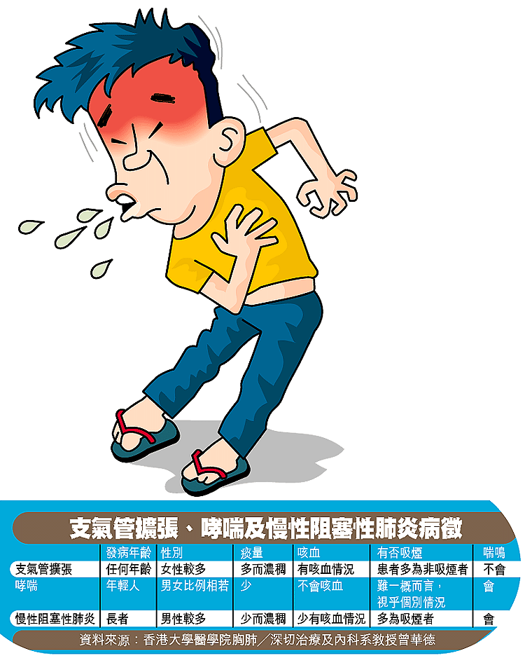 【本報訊】長期咳嗽痰多,可能是患上致命的支氣管擴張。有學者指出,一般人容易將此病與哮喘及慢性阻塞性肺病混淆,當中約兩至三成屬誤診,有病人更被誤診達十五年之久,致病情惡化;近一成嚴重患者更需要接受肺部移植,因此建議經常咳痰的患者進行電腦掃描,找出病因。 記者:張嘉雯