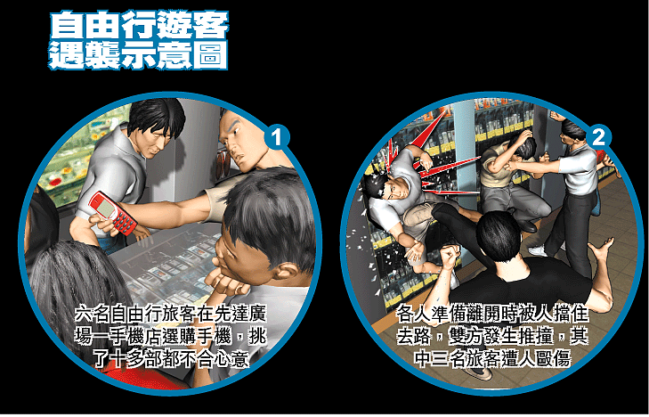 【本報訊】旺角先達廣場的一家手提電話專賣店昨午發生惡店員涉嫌毆打自由行遊客事件,六名分別來自河南及山西的自由行遊客,慕名往先達廣場選購手機,但挑了十多部都不合心意,準備離開時竟遭人惡吼:「你哋嚟混吉㗎?」有人更指事主左挑右選「唔幫襯」而阻止他們離開,雙方互相推撞,撞破手機店的櫥窗玻璃,混亂中,兩男一女遊客被人毆傷。警員到場拘捕兩名逞兇店員。其中一名受傷遊客在現場向圍觀者大聲說:「你們香港人就是這樣做生意的嗎?難道不買就要被人揍?」 記者:冼豪文