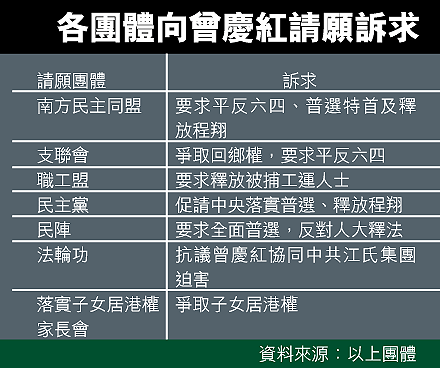 【本報訊】國家副主席曾慶紅昨日馬不停蹄,展開訪港行程的多項活動,本港不同民間團體亦把握機會,在不同地方、以不同形式,冀望向中央領導人直接表達「平反六四」及「爭取雙普選」等不同訴求,其中一名女子更趁曾慶紅前赴牛頭角探訪彩頤居長者期間,企圖衝出馬路攔車申冤,央求領導人替其亡兄申冤,險象環生。 記者:蔡建豪、黃學潤、卓永強