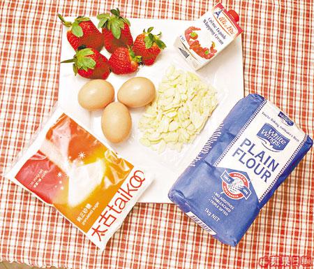 麵粉50克、砂糖60克、雞蛋3隻、士多啤梨150克、鮮忌廉150毫升、糖霜30克、杏仁片80克