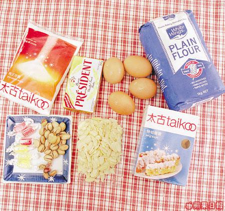 麵粉400克、牛油200克、砂糖120克、鹽1/4茶匙、雞蛋2隻、果汁糖1-2粒、開心果仁適量、糖霜300克、蛋白2隻、杏仁片100克、雞蛋1隻(塗蛋漿用)