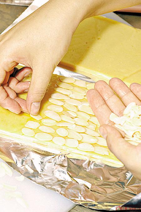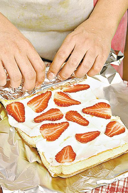 2.Addicingsugarintofreshcreamandmixwell,putintoicewater,thenwhipuntilitcanstandupandspreadovercake,layslicedstrawberryontop,rollupandspreadcream,sprinkleflakedalmond,cutintopieces,andspreadcreamandalmondagain.