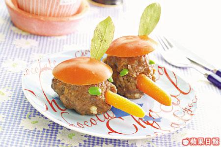 牛肉加醃料醃15分鐘,肥豬肉蒸熟切粒,與雜菜同拌入牛肉內擠成球。番茄切去底部去籽,放牛肉球上;甘笋汆水扮鼻子、青豆作眼睛,猛火蒸8分鐘至熟透,番茄上插上月桂葉即成。