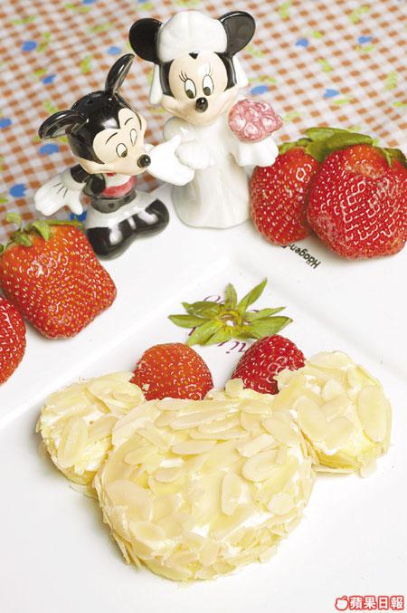 米妮:「除咗打理花園,我最鍾意焗蛋糕整曲奇招呼朋友。只用三個大小不同的圓形蛋卷拼埋,加多兩粒士多啤梨,就可以扮我啦!」