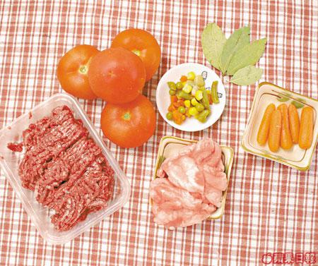 免治牛肉6両、番茄4個、月桂葉4塊、迷你甘笋4條、雜菜30克、肥豬肉少許、青豆數粒