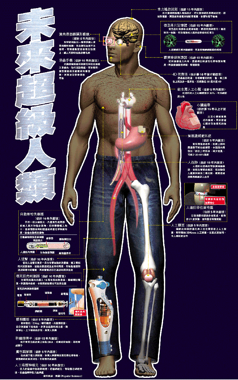 科學家不斷研製技術或藥物救助體弱病人,但這些技術和藥物同時也適合健康人士使用,令不久將來,人們可透過新藥或新技術,搖身變成體力強壯、思想聰敏的「超級人類」。圖右是未來「超級人類」的解構: