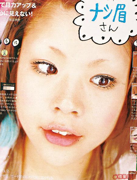日本女生最近興玩又激又令人印象難忘的淺眉大眼妝,焦點落在條條豎起的睫毛和大圓黑眼睛,眉毛色淡或近乎無眉階段,胭脂和唇膏全部不要,以突出眼妝,適宜眉形稀疏和幼淡的女生。