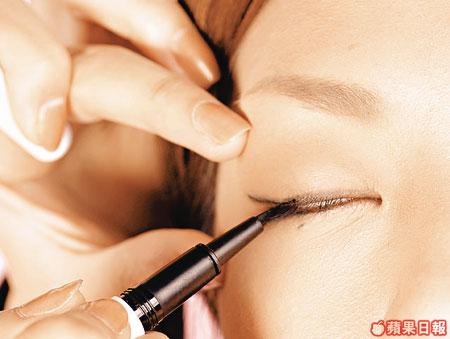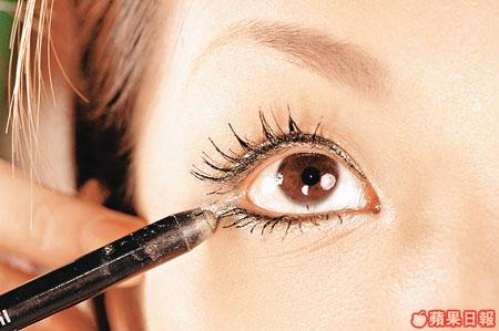 ■以眼線液畫上下眼線。上眼線尾部勾起,中間位置加粗,令眼睛更圓更大。