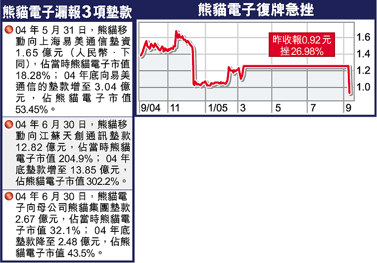 此外,熊貓電子04年期間,先後3次未按上市規則,漏報墊款情況,至04年底涉及墊款金額合共19.36億元人民幣,當時公司時值只有5.69億元(附表)。