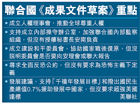 不過,對於《草案》刪去原來積極的改革大計中多處有爭議地方,各方表示失望。聯合國秘書長安南指雖然「沒法如願,但可本着《草案》繼續努力」,但未能就核不擴散及裁軍達成協議,「實在丟臉」。