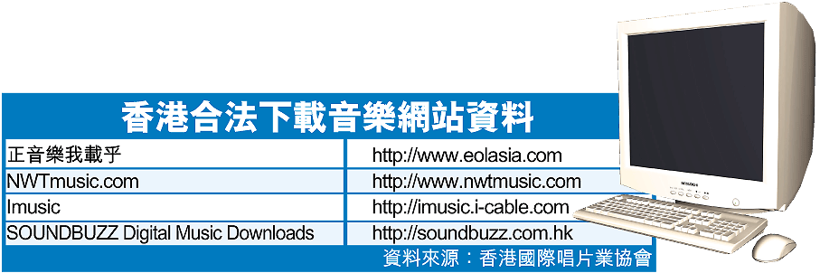 唱片業協會表示,非法下載音樂網站自五年前開始湧現,本港中文唱片的零售總額由○○年的逾九億元,下跌至去年的二億多元,唱碟平均售價由五年前的七十八元一張,急跌至去年的五十八元一張。該會前年的調查估計,P2P侵權行為令本港和台灣唱片業每年損失六億元。