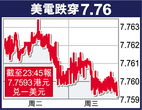 【本報訊】由於一些配股交易需港元結算,帶動近日港滙現貨需求增多,昨日港滙一度穿越7.76兌一美元水平,最強曾見7.7593,與金管局承接美電沽盤的兌換保證價7.75,相距不足100點子,但港滙遠期及人民幣不交收遠期滙價,大致穩定。人民幣在外滙交易中心的中間交易價,今日報每美元兌8.0912,是滙率調整以來的最強水平。