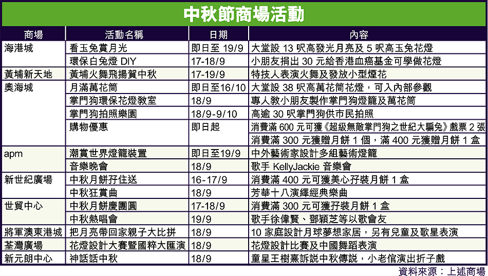 中秋節假期留港消費不愁寂寞,全港多個商場舉辦種種動靜皆宜的節目;有首個巨型萬花筒花燈供巿民欣賞拍照,也有動感十足的煙花火舞滙演;主攻年輕人市場的商場則展出至潮藝術花燈和舉辦流行音樂會,提供戶外賞月以外的選擇。 記者:蔡朗清 黃嘉寶