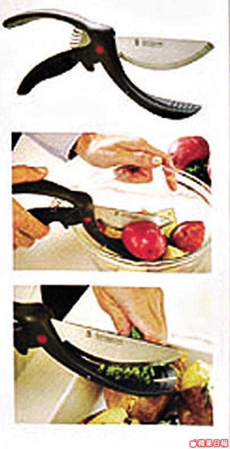 雙刀片,中間空心,連底下的墊托都附有刀片,換言之即孖剪刀。只須把材料如番茄一「剪」,一下即可剪出一片靚靚番茄,慳了一半工夫。