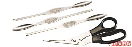 不外乎三個功能,夾爆蟹殼、剪斷蟹腳、叉入撩腳肉和拔蟹膏。