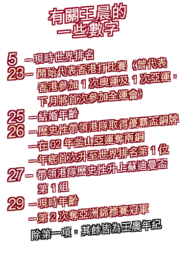 現時世界排第五、二十九歲的王晨,自九九年來港發展到現在,也沒有對假日多了認識;而最長的假期,也只不過是農曆新年的四至五天假期。相信王晨這種「節日冷感」還要延續多幾年,因為明年的多哈亞運,甚至是○八北京奧運會仍是王晨的目標。