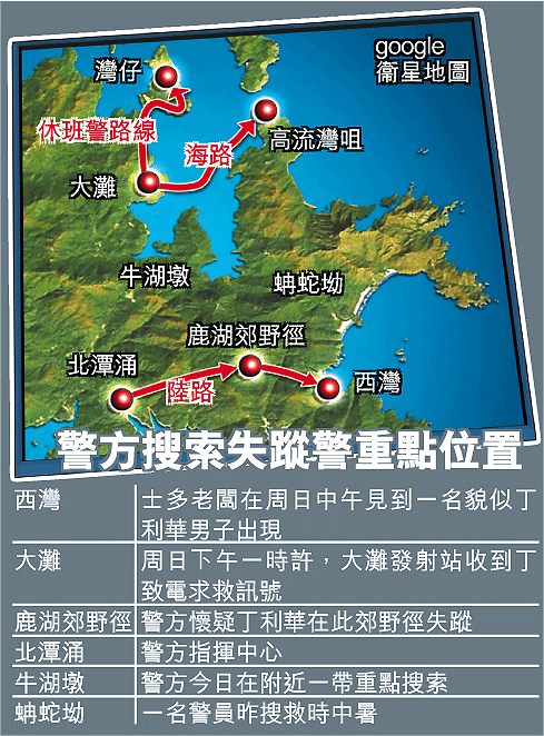 據警方消息指,丁利華失蹤當日的中午十二時,在西灣的士多老闆,曾見過一名貌似丁的男子出現,在下午一時許,大灘發射站收到他致電求救的訊號,警方懷疑他在鹿湖郊遊徑失蹤,但連日來在該處搜均無發現。