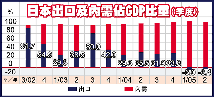 觀乎近期數據,日本本土經濟無疑正逐步改善,以往過度依賴由出口帶動的復甦勢頭,漸漸由本土需求增強所取代,成為主要的增長動力來源(見附圖),這反映出日本經濟可能終於「真真正正」的出現一次復甦。