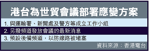 【本報訊】政府就年底舉行的世貿部長級會議嚴陣以待,據知當局已要求相關部門提交緊急應變計劃報告,避免出亂子。作為轉播機構的香港電台,已計劃一連串應變措施,除會預備後備頻道,嚴防有人惡意「jam」線、干擾直播外,亦會在有需要時撥出頻道,發放會內會外的最新消息,以便疏散人流。 記者:許偉賢