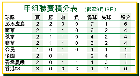 【本報訊】澎馬流浪昨午在旺角球場上演的甲組足球聯賽「雙料娛樂」尾場,憑突擊戰術奏效,以三比一擊敗愉園,兩戰全勝進佔榜首;而南華在頭場藉老將歐偉倫梅開二度,以五比○大勝香港08。