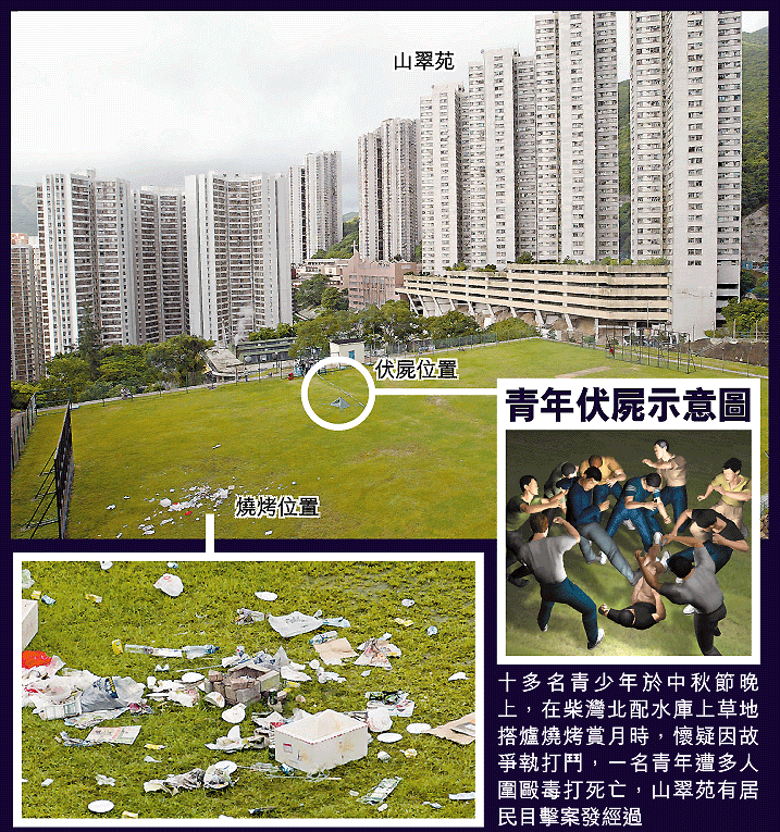 警方港島重案組探員,昨午亦到山翠苑向居民查問情況,警方相信事主是十多名賞月燒烤青少年的其中一人,懷疑玩得忘形發生爭執,事主與人毆鬥或遭多人圍毆致死,行兇者肇禍後四散,警方正追緝涉案青少年歸案。