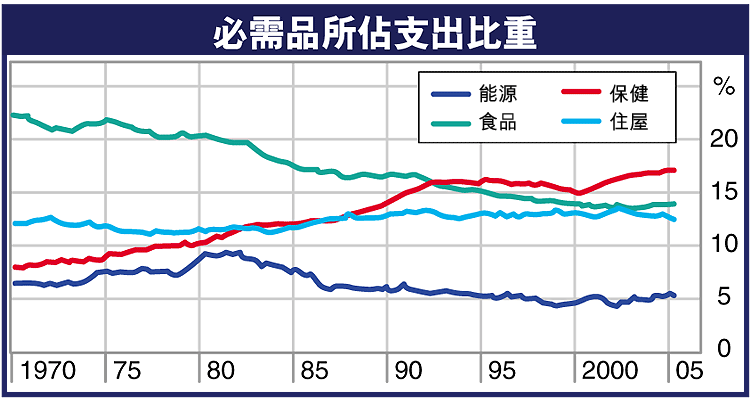 此外,根據美國官方的數字,保健開支佔消費物價的比重只有6%,但美國商務部旗下經濟分析局卻透露,保健在消費開支中所佔比重多達17%(見附圖)。上述例子已充份暴露,美國政府原來經常編造美麗謊言,歪曲經濟的健康狀況。少報通脹數字,不但令債券市場被愚弄,實質經濟增長數字亦會被人為地誇大,因為實質GDP是由名義GDP減去通脹率而得出。例如名義GDP為成長6%,而通脹率並非3%而是5%的話,實質GDP便只有1%,而非3%。