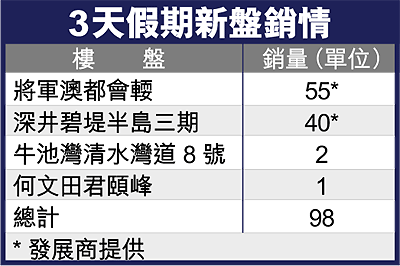 由於新盤銷情集中在兩個大型新盤,其他只有2個貨尾盤共錄得3宗成交,4個新盤共售出98伙,都會駅及碧堤半島三期,已分佔56.1%及40.8%。