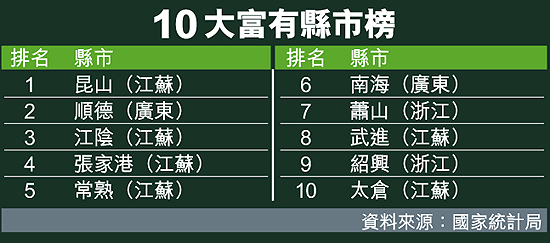 「郡縣治,則天下治。」了解中國經濟發展的形勢,除着眼於大城市外,當前地方縣(市)的發展是不容忽視的一環。根據國家統計局公布的全國最富有十大縣市排名顯示,江蘇的昆山市首次取代連續四年穩居冠軍寶座的順德奪冠;順德屈居亞軍,季軍是江蘇的江陰市。十大縣市全由江蘇、浙江和廣東三省所包辦。